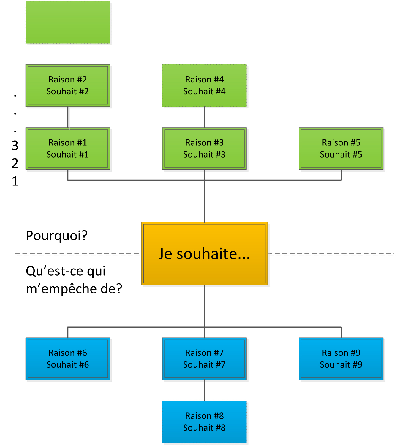 Dans la case au centre on inscrit notre souhait initial. Par exemple : « je souhaite qu’il n’y ait plus de taxe de vente au Québec. » Ensuite on débute par se poser la question pourquoi on a ce souhait. Dans la partie du haut, on inscrit au premier niveau chaque raison dans une nouvelle boite. Ensuite on reformule chaque raison en un nouveau souhait et on poursuit avec un autre pourquoi. Jusqu’à arriver à une raison générale ou une vérité absolue. Par exemple, on voudrait éliminer la taxe de vente pour avoir plus d’argent dans nos poches. Alors on reformulerait : « Je souhaite avoir plus d’argent. » On se pose encore une fois pourquoi on voudrait avoir plus d’argent et on arrive à une deuxième raison qui pourrait être : « pour être plus à l’aise dans la vie. » En reformulant à nouveau, on arrivera tôt ou tard à une raison comme : « pour être plus heureux » et inévitablement à : « parce que tout le monde veut être heureux ». À ce moment-là, on doit arrêter la chaîne des pourquoi.