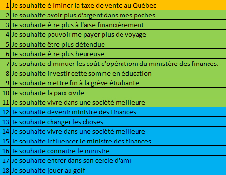 À partir de cette liste on peut utiliser plusieurs outils de sélection pour déterminer quel est notre souhait profond ou quel sont les souhaits qui reviennent le plus souvent. On peut alors avancer que c’est ce sur quoi on doit travailler. Je traiterai des outils de sélection dans un prochain article.
